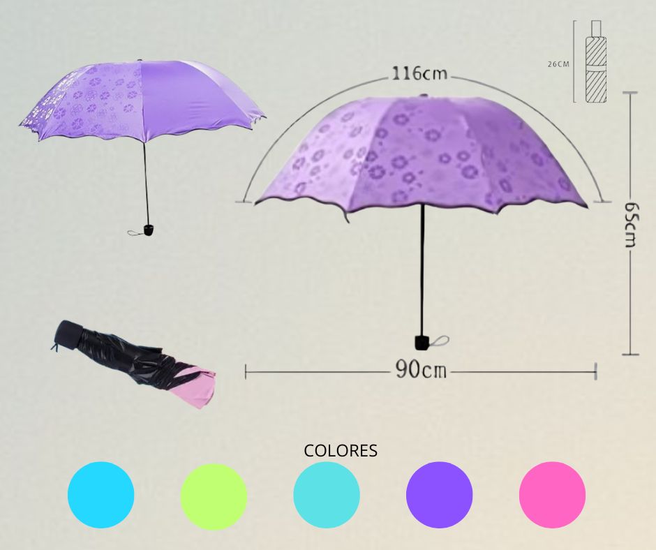 Paraguas compacto con filtro de protección solar que revela un elegante estampado floral al contacto con la lluvia. Su diseño de bolsillo ofrece protección dual contra sol y lluvia, transformándose mágicamente de una superficie lisa a un patrón decorativo cuando se moja, combinando funcionalidad y estilo en cualquier condición climática.